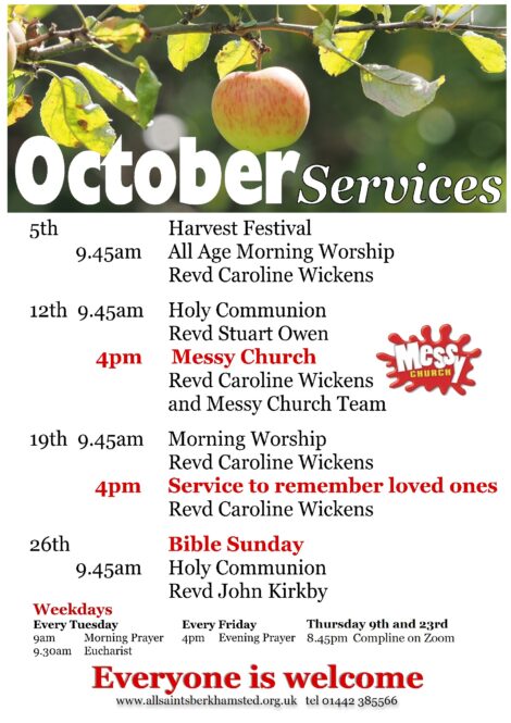 Harvest Festival (Sunday 5 October) – Harvest Appeal. Thank you to all who contributed with goods for DENS and/or money for The Bishop of St Albans Harvest Appeal (for Mission Direct) and for All We Can. The money raised totaled £1,411 including gift aid, to be shared equally between the two causes.